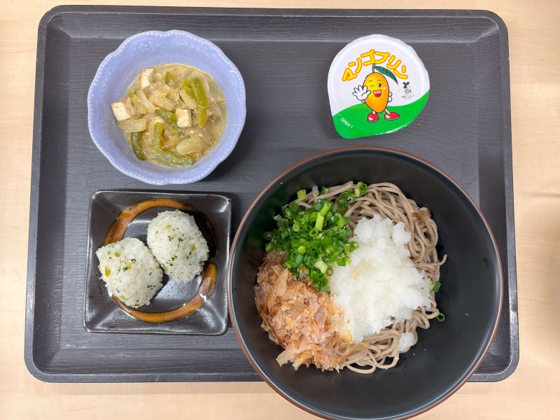 田舎そばに大根おろし、ネギ、かつお節をのせ、だしをぶっかけて食べるのが特徴です。