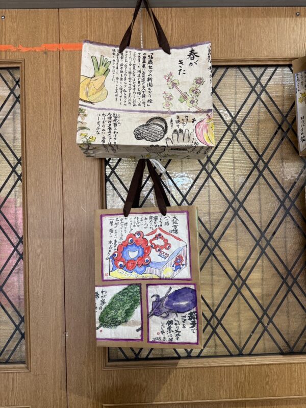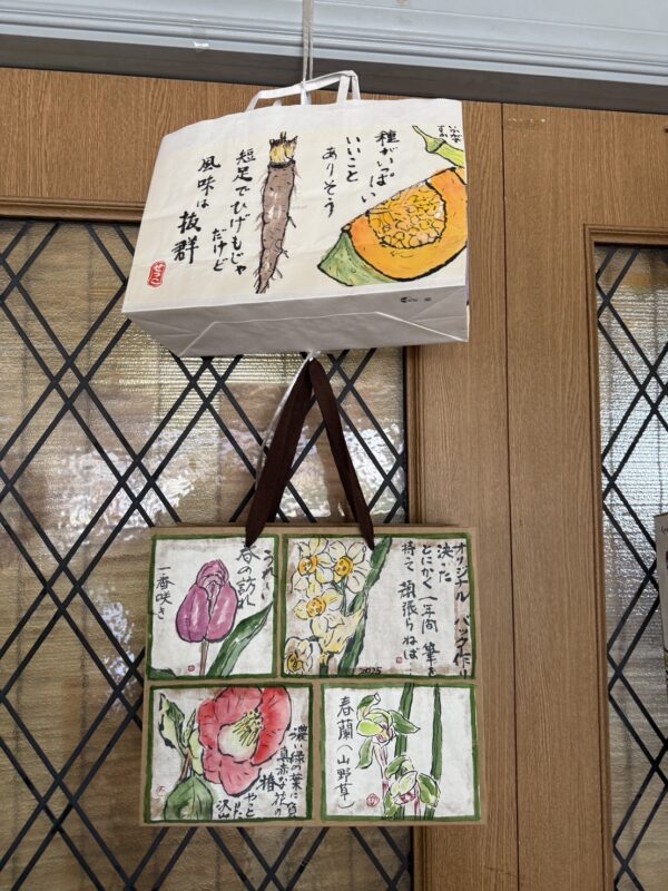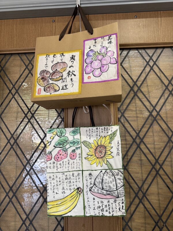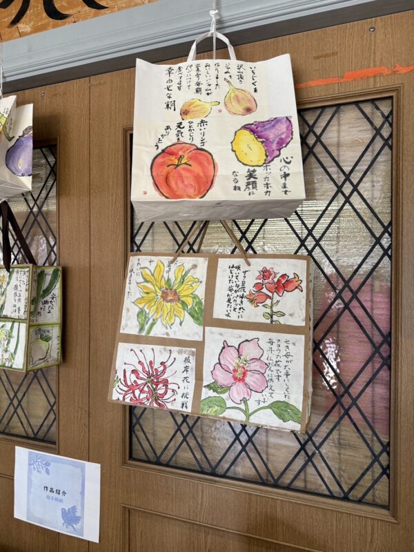 季節の花や風景をモチーフに、一枚一枚心を込めて描かれた絵手紙は、どれも温かみのある作品ばかり。最近では、手作りの紙バッグにも素敵な絵が描かれ、来所される方々の目を楽しませています🎨💐