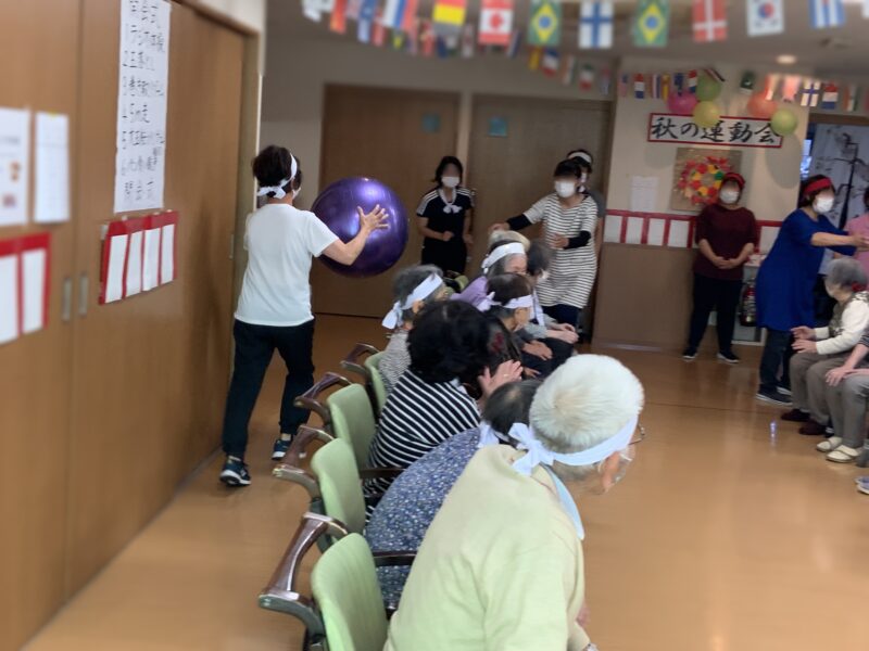 職員と一緒に大玉を隣へ送ります。職員はリレー方式で、チーム最後尾の方まで転がしたら、大玉を抱え上げてスタートまで戻り、次の走者へ繋ぎます。