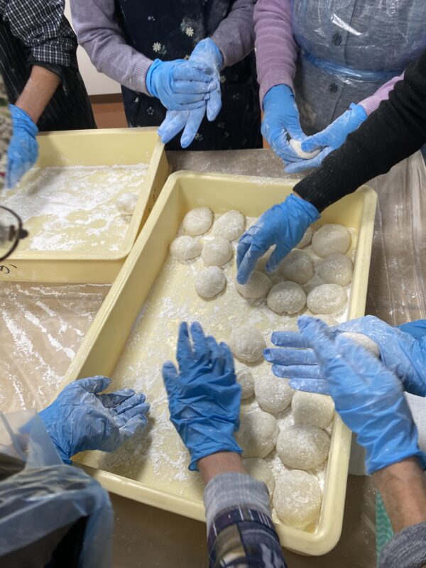 職員も先輩方の指導で餅を丸めます😆
